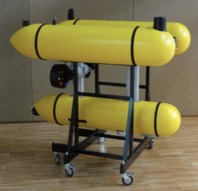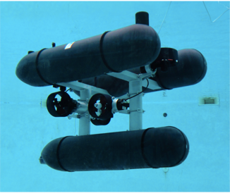 The GIRONA 500 is a reconfigurable autonomous underwater vehicle (AUV) designed for a maximum operating depth of up to 500 m (see figure 2). The vehicle is composed of an aluminum frame which supports three torpedo-shaped hulls of 0.3 m in diameter and 1.5 m in length as well as other elements like the thrusters. This design offers a good hydrodynamic performance and a large space for housing the equipments while maintaining a compact size which allows operating the vehicle from small boats. The overall dimensions of the vehicle are 1 m in height, 1 m in width, 1.5 m in length and a weight of less than 200 Kg. The two upper hulls, which contain the flotation foam and the electronics housing, are positively buoyant, while the lower one contains the more heavy elements such as the batteries and the payload. This particular arrangement of the components separates the centre of gravity from the centre of buoyancy by about 11 cm, which is significantly more than found in a typical torpedo shape design. This provides the vehicle with passive stability in pitch and roll, making it suitable for tasks that will benefit from a steady platform such as interventions or imaging surveys.